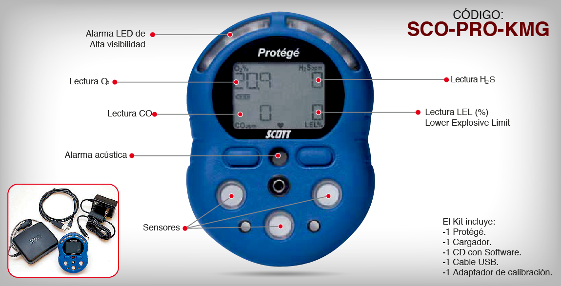 FUNCIÓN El objetivo principal de un detector de gas o de un sistema de gas es alertar al usuario de una situación potencial de riesgo. CARACTERÍSTICAS Cubierta azul de alta visibilidad. Cubierta durable, ABS /Rubber. Peso: 7,5 OZ. Alarmas LED de alta visibilidad. Pantalla fácil de leer. Alarma audible, visual y sensorial. Multi-gas: O2, H2S, CO y LEL(%). VENTAJAS Monitor personal de multiples gases diseñado para monitorear los niveles potencialmente peligrosos de gases combustibles, enriquecimiento o deficiencia de oxígeno, monóxido de carbono y sulfuro de hidrógeno. Fuerte construcción robusta. Configuración y conexión sencilla a PC. Auto-prueba funcional al encender. Lectura continua de gases. Registra grabación hasta 7000 eventos (Data-log). Graba alarmas STEL/TWA, calibraciones y valores de gases con fecha. Bomba de muestreo continuo opcional. APLICACIONES Alimentos y bebidas. Industria del acero. Agricultura. Industria petrolera. Tratamiento de aguas. Minería. EMPAQUE TIPO DE EMPAQUE: Caja. MÚLTIPLO DE VENTA: Por pieza.