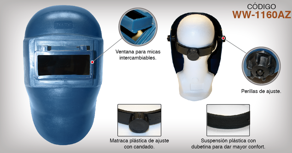 FUNCIÓN Protege la vista y reduce el riesgo de quemaduras por chispas, salpicaduras y pedazos de metal caliente presentes en las tareas de soldadura. CARACTERÍSTICAS Fabricada en material termoplástico de alta resistencia al calor. Suspensión con ajuste de matraca. Ventana ajustable para micas sombra o de cristal intercambiables. Dimensiones lente/filtro: 10.8 cm de ancho x 5 cm de alto. Dubetina en la frente removible y lavable. VENTAJAS Cubre rostro y cuello para evitar quemaduras. Matraca de plástico en la parte de atrás, para ajustar al tamaño de la cabeza Resistente a impactos y temperaturas. Ventana para micas intercambiables. Incluye cristal claro y cristal sombra 12. APLICACIONES Trabajos de la Soldadura en General. EMPAQUE TIPO DE EMPAQUE: Granel. MÚLTIPLO DE VENTA: Caja con 25 piezas.