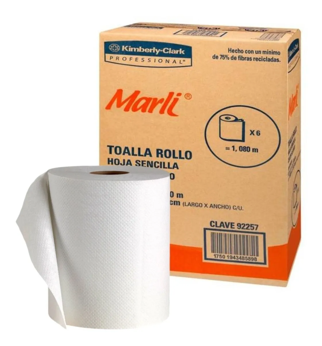 Toalla en rollo Hoja sencilla color blanco. Las toallas Marli te ofrecen desempeño en todas sus presentaciones. Elaboradas con tecnología convencional, son excelentes productos para secado de manos y tareas de limpieza sencilla. Son la opción más económica del mercado, ya que están fabricadas con un porcentaje de fibras recicladas para ayudar a la sustentabilidad ambiental. Puede usarse en cualquier despachador del mercado. Resistente y absorbente. 100% de fibras recicladas.