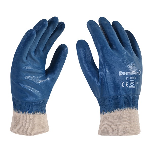 MODELO: 87-402 MARCA: Derma Care Fabricado de algodón con nitrilo en la palma y el dorso, puño tejido de punto, el interior contiene un agente fungincida Sanitized* . Recubierto de nitrilo en palma y dorso completo, el forro interno de algodón contiene un fungicida Sanitized*, que retarda la aparición de microorganismos, esto permite la utilización de este guante en periodos de tiempo prolongados. Excelente protección para trabajos ásperos, cortantes y abrasivos. Empaque: 120 PARES POR CAJA