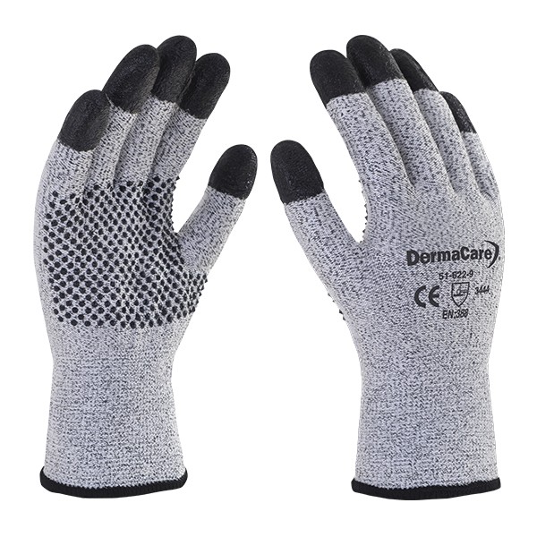 Guante anticorte con protección nivel 5, novedoso diseño con recubrimiento de nitrilo negro en la punta de los dedos y punteado en palma, excelente opción para procesos con riesgo de corte y que se requiera tener buen agarre en seco.